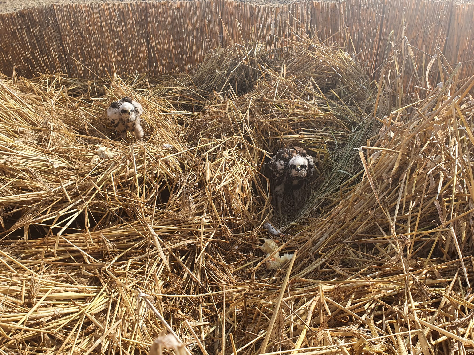 Om te kijken of er met een ander soortige afrastering, in Gallische stijl het vrouwtje misschien wel op het nest durft te komen gaan we experimenteren. Ter vervanging van van het stroomhek en het gaas komt er een rand van rietmatten. Het vrouwtje kwam daarna met een prooi verrassend dichtbij boven het nest cirkelen maar ze laat uiteindelijk de prooi buiten de afrastering vallen. Dan eerst nog maar zelf weer voer brengen.