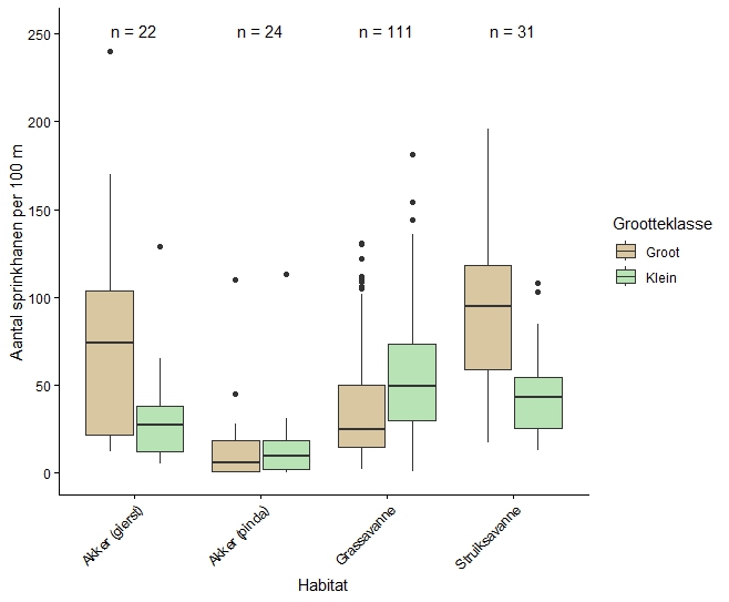 Voor het eerst hebben we al in november sprinkhaantellingen uitgevoerd, direct na de regentijd wanneer het gebied nog groen is. Dat sprinkhanen van groene vegetatie houden, zien we duidelijk terug in de eerste voorlopige resultaten: de hoogste aantallen werden aangetroffen in de struiksavanne, gevolgd door gierstakkers en grassavanne. Grote sprinkhanensoorten kwamen vooral voor in struiksavanne en gierstvelden, terwijl kleine soorten talrijker waren in grassavanne (Figuur 1). In de bijna kale pinda-akkers werden nauwelijks sprinkhanen gezien. Met de maandelijkse herhalingen willen we de aantalsontwikkeling zien richting het veel drogere einde van het winterseizoen.