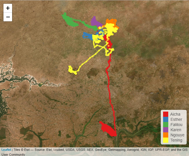 Figuur 2. Kaartje met de GPS-locaties van de zes in Senegal (Khelcom) gezenderde grauwe kiekendieven.