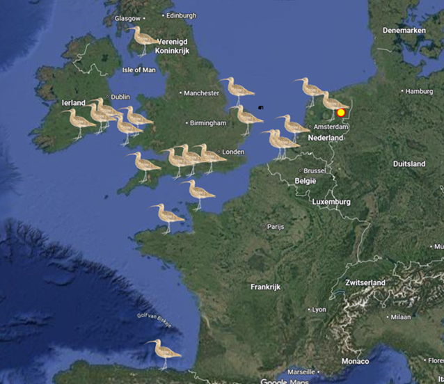 In de periode 2019-2025 zijn in Drenthe in totaal 98 vogels gekleurringd. Van deze vogels zijn er inmiddels dertig (30.6 %) teruggemeld: twintig vogels in overwinteringsgebieden en tien vogels tijdens het broedseizoen. Hiervan zijn zes vogels zowel in het overwinteringsgebied als in het broedgebied teruggezien. In Figuur 1 is een overzicht gemaakt van vogels die buiten het broedseizoen zijn afgelezen. Het merendeel vliegt pal west en is terug gezien langs Britse en Ierse kusten. Andere vogels overwinteren continentaal in Spanje, Frankrijk, België en in Nederland zelf. Tijdens het broedseizoen worden veel vogels in de buurt van de geboorteplek gezien (soms op nog geen 200 m van de geboorteplek). Maar er zijn ook voorbeelden dat vogels 160 kilometer oostelijk in Duitsland opduiken. Kortom, een beetje variatie is wulpen niet vreemd.